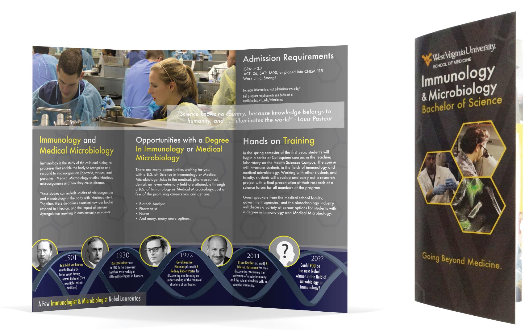 The Microbiology & Immunology department at WVU requested a tri-fold brochure be made to entice students seeking to join the STEM fields. An informational focus was mandated.
